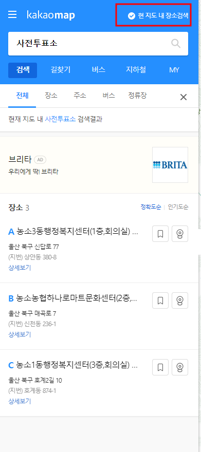 왼쪽에 "현 지도 내장소 검색" 체크