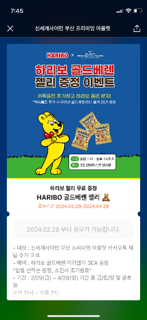 신세계사이먼 부산 프리미엄 아울렛에서 행사정보를 알려드리려고 합니다. 하리보젤리 무료증정 행사는 2월 ~ 4월까지 진행되는 행사로 신세계아울렛 부산 방문 시 행사 확인 하셔서 혜택 받아가시길 바랍니다.