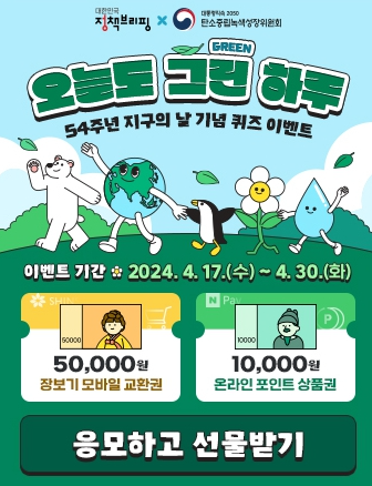 매년 4월 22일은 지구 환경오염 문제의 심각성을 알리기 위해 자연 보호자들이 제정한 지구의 날 입니다. 웹툰을 보고 퀴즈를 맞추신 분들께는 추첨을 통해서 이마트 상품권 5만원, 네이버 포인트 1만원이 증정됩니다.
