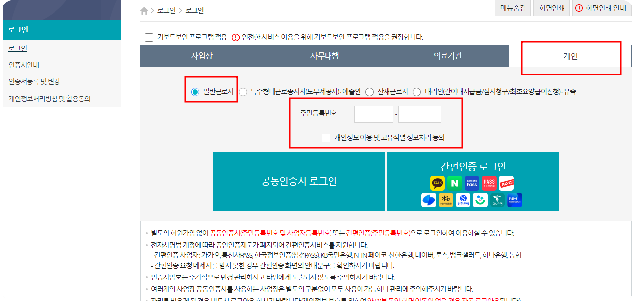 -> " 공동인증서 로그인" 또는 "간편인증 로그인"