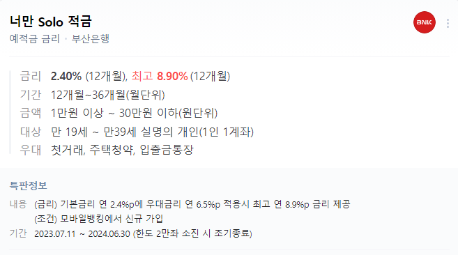 첫번째로는 부산은행 너만 Solo 적금입니다.