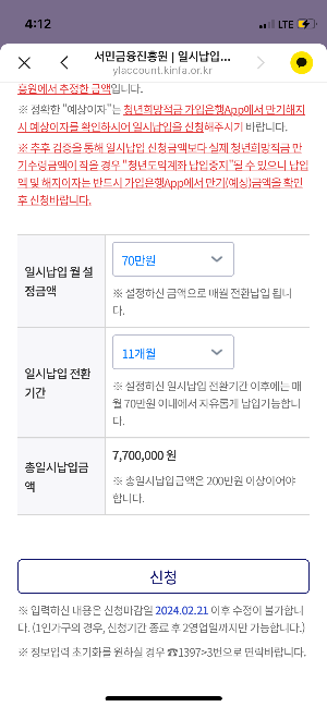 청년도약계좌 가입신청(사전조회)를 해놓았더니 서민금융진흥원에서 카톡이 왔어요. 2004년 2월 21일 내에 입력하시지 않을 경우 기본납입방식으로 자동 신청되오니 일시납입을 원하는 경우에는 신청기한을 반드시 준수해달라는 카톡이더라구요. 그래서 일시납입금액 신청하는 방법과 혜택을 알려드리려고 합니다.