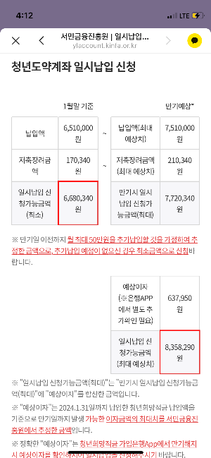 합친금액이 최대 일시납입금으로 신청 가능금액