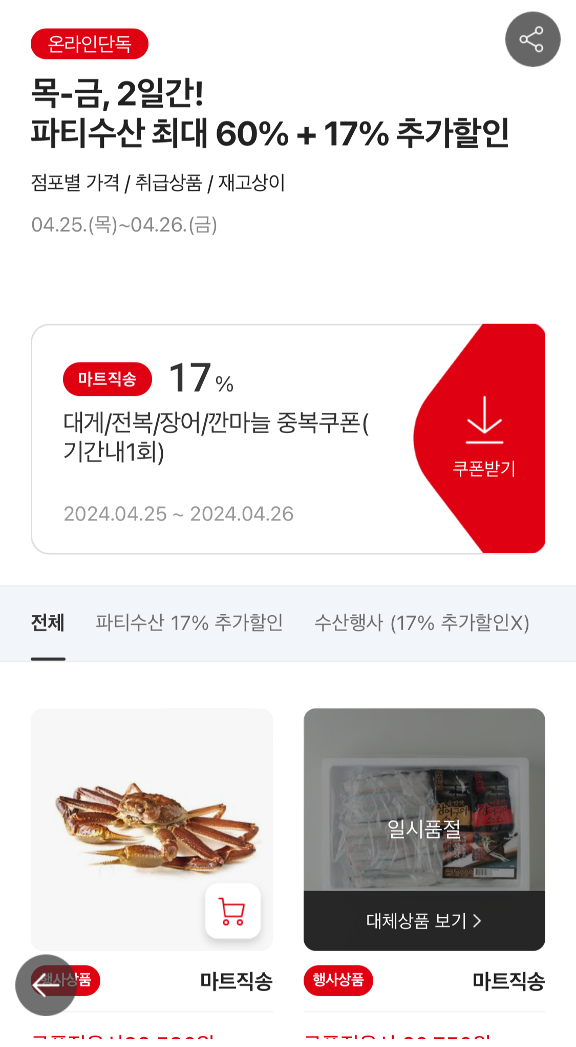▷ 목 ~ 금 파티수산 최대 60% 할인 + 할인쿠폰 17% 추가 할인