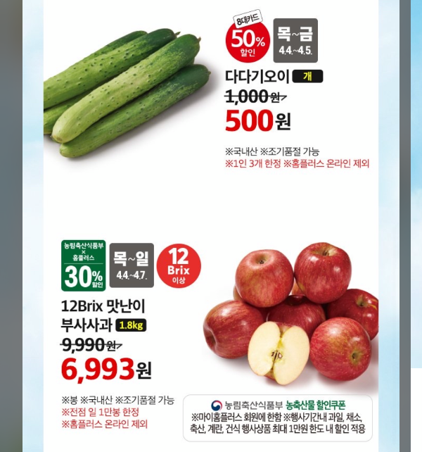 4월 홈플러스 홈플런 전단이 나왔습니다. 다양한 행사로 인해서 오이, 딸기, 계란 등 비쌌던 상품을 저렴하게 구매 할 수 있을 것 같습니다. 행사기간은 4월4일(목)부터 4월7일(일)까지입니다.
